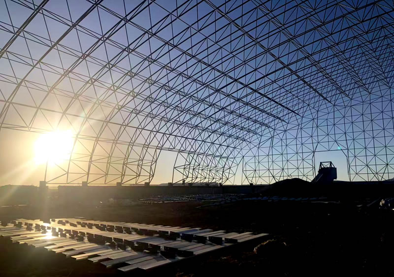 3、材料:正放四角锥螺栓球节点网架,按照甲方确认的图纸设计要求加工制作。网架主材材质为Q355B钢管,底漆二道70um,主檩条镀锌C型钢C220*75*20*3.0,次檩条镀锌C型钢C180*70*20*2.5,屋面板0.5mm厚彩钢单板